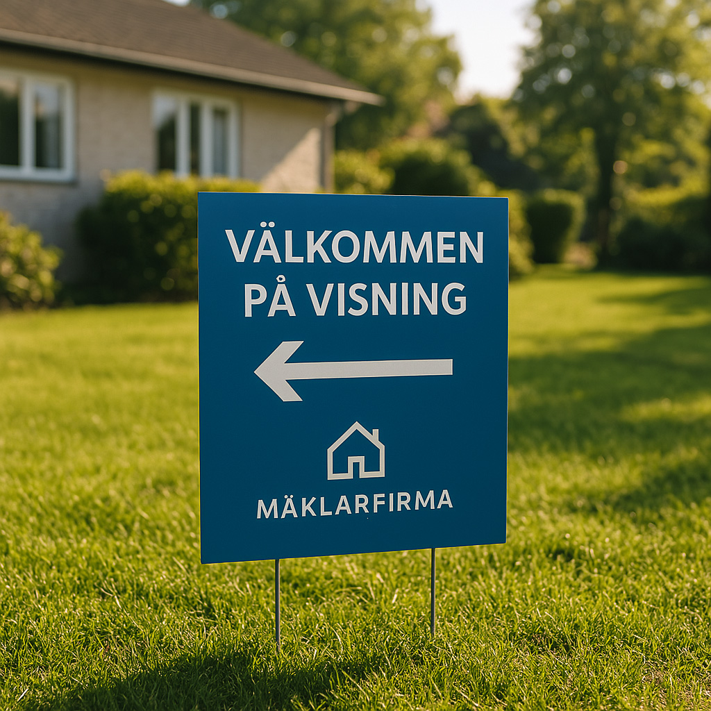 Väderbeständiga skyltar med eget tryck – perfekt för mäklare, byggföretag, eventarrangörer och fler.